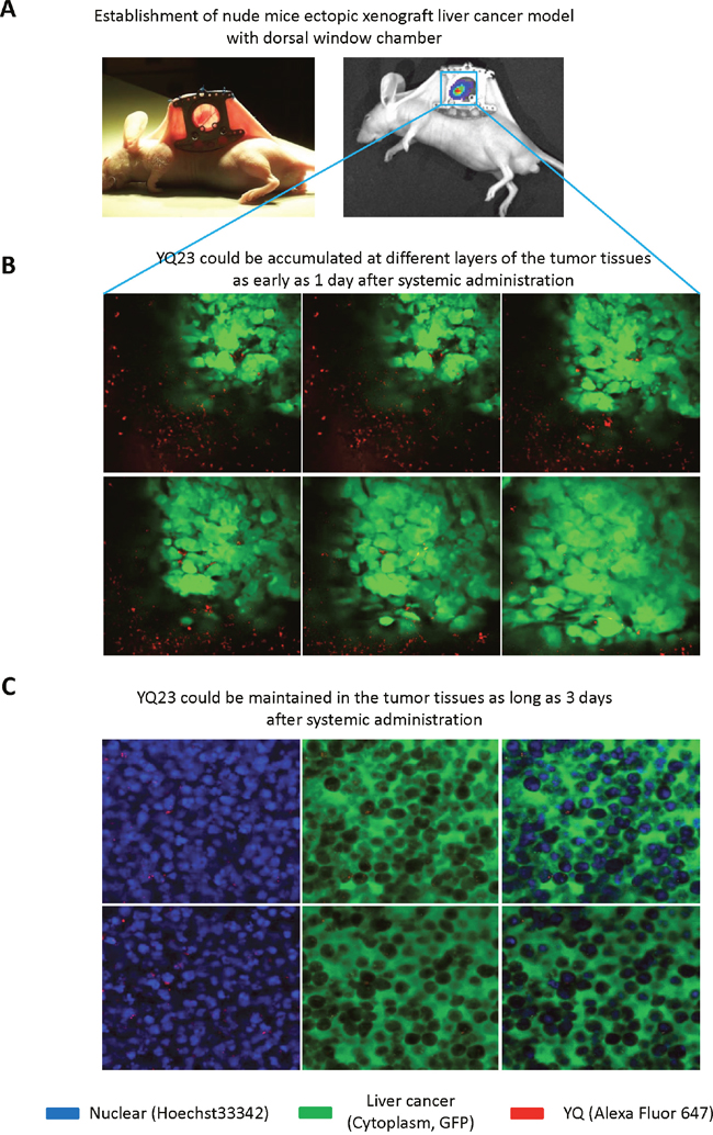 Figure 6: Real-time intravital imaging (Confocal) showed that YQ23 accumulated in the tumor tissue in ectopic xenograft liver cancer model using dorsal window chamber. (A) Establishment of nude mice ectopic xenograft liver cancer model with dorsal window chamber. (B) YQ23 could be accumulated at different layers of the tumor tissues as early as 1 day after systemic administration. (C) YQ23 could be maintained in the tumor tissues as long as 3 days after administration.