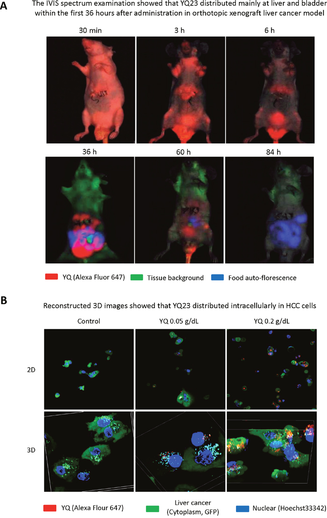 Figure 7: Examination of YQ distribution in the whole body and tumor cells. (A) The IVIS spectrum examination showed that YQ23 distributed mainly at liver and bladder within first 36 hours after injection and gradually excreted through bladder afterwards. (B) YQ23 could be accumulated intracellularly in HCC cells as early as 1 day after administration.