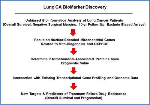 Figure 1: Diagram showing our bio-informatics approach to lung cancer biomarker discovery. For this analysis, we chose to focus on non-small lung cancer patients, with negative surgical margins, and 10-years of follow-up data (N = 726). In this context, we evaluated the prognostic value of mitochondrial markers for predicting overall survival, time to first progression, and post-progression survival.