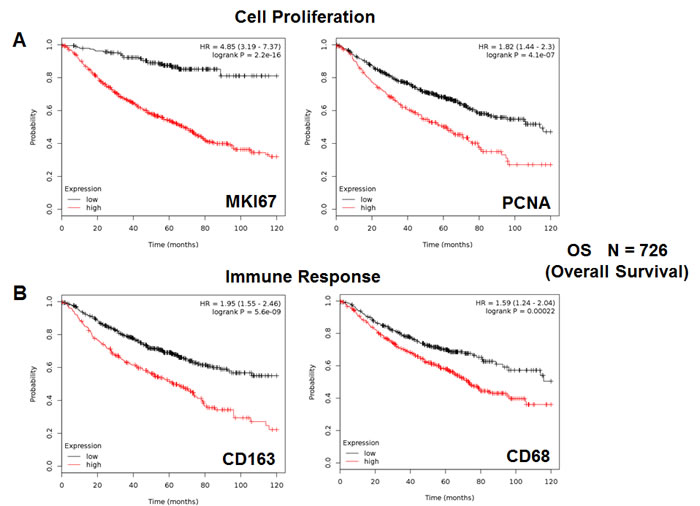 Figure 2: Markers of proliferation and inflammation predict poor overall survival in high-risk lung cancer patients. We assessed the predictive value of Ki67 and PCNA in N = 726 lung cancer patients, with negative surgical margins. A. Note that high transcript levels of Ki67 and PCNA are associated with significantly reduced overall survival. Please note that the official gene name for the Ki67 protein is MKI67. B. Note that that high transcript levels of CD163 and CD68 are associated with significantly reduced overall survival.