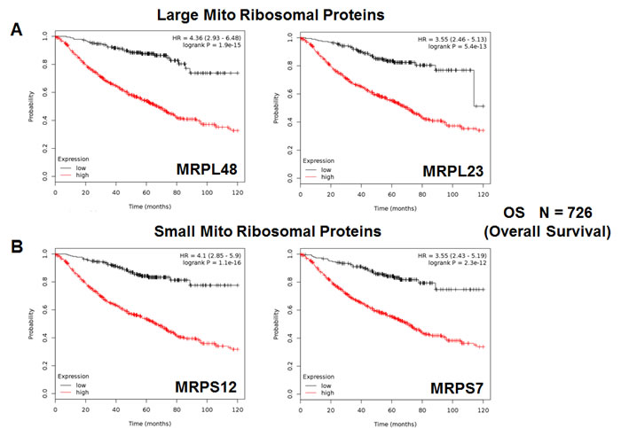 Figure 4: Mitochondrial ribosomal proteins (MRPs) are associated with poor clinical outcome in lung cancer patients. A. Note that high transcript levels of MRPL48 and MRPL23 predict significantly reduced overall survival. B. Similarly, high transcript levels of MRPS12 and MRPS7 predict significantly reduced overall survival.