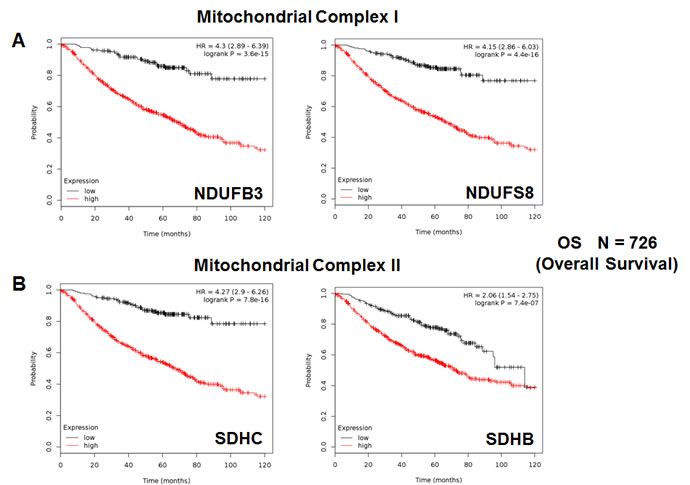Figure 5: Mitochondrial complex I and II proteins are associated with poor clinical outcome in lung cancer patients. A. Note that high levels of NDUFB3 and NDUFS8 predict significantly reduced overall survival. B. Similarly, high levels of SDHC and SDHB predict significantly reduced overall survival.