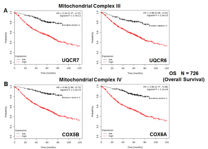 Figure 6: Mitochondrial complex III and IV proteins are associated with poor clinical outcome in lung cancer patients. A. Note that high levels of UQCR7 and UQCR6 predict significantly reduced overall survival. B. Similarly, high levels of COX5B and COX6A predict significantly reduced overall survival.