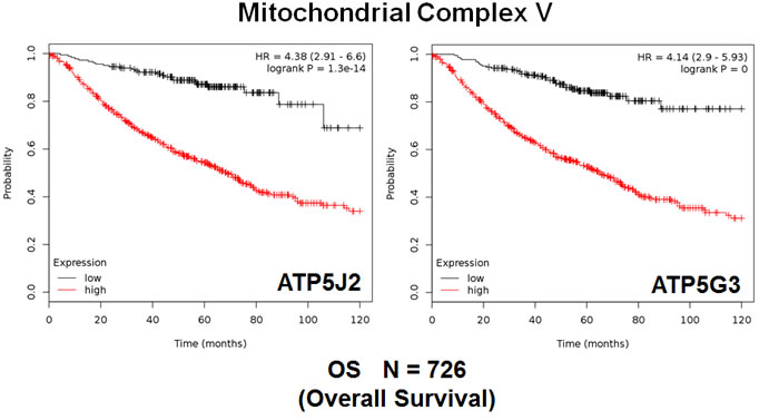 Figure 7: Mitochondrial complex V proteins are associated with poor clinical outcome in lung cancer patients. Note that high levels of ATP5J2 and ATP5G3 predict significantly reduced overall survival.
