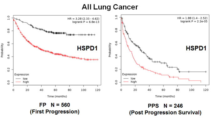 Figure 8: The mitochondrial chaperone, HSPD1, predicts tumor progression in lung cancer patients. Note that the levels HSPD1 effectively predict time to first progression (Left panel) and post-progression survival (Right panel).
