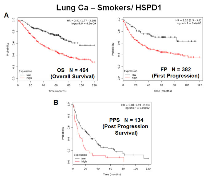 Figure 9: The mitochondrial chaperone, HSPD1, predicts poor clinical outcome and tumor progression in lung cancer patients: Smokers. Note that the levels HSPD1 effectively predict overall survival A., as well as time to first progression and post-progression survival B., in the “smoking” patient population.