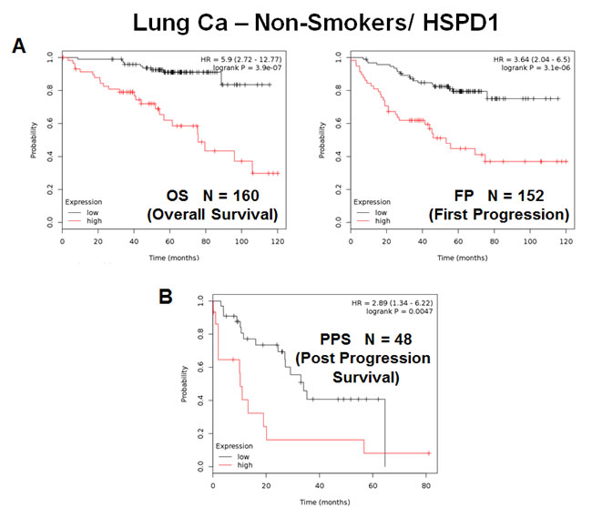 Figure 10: The mitochondrial chaperone, HSPD1, predicts poor clinical outcome and tumor progression in lung cancer patients: Non-Smokers. Note that the levels HSPD1 effectively predict overall survival A., as well as time to first progression and post-progression survival B., in the “non-smoking” patient population.