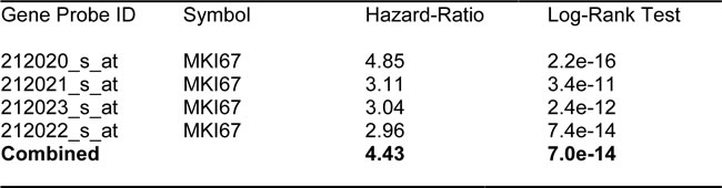 To identify new potential biomarkers, here we used publically available transcriptional profiling data from the tumors of lung cancer patients, with negative surgical margins (Figure 1), with 10 years of follow-up. Since proliferative markers are used as primary endpoints in clinical trials, we first assessed the prognostic value of Ki67 and PCNA, in this patient population. Tables 1, 2 and Figure 2A both show the prognostic value of these markers. The hazard-ratios for Ki67 and PCNA were 4.85 and 1.82, respectively, for overall survival (OS).