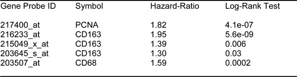 We also assessed the prognostic value of two macrophage-specific markers of inflammation. Table 2 and Figure 2B show that CD163 and CD68 both effectively predict overall survival, with hazard-ratios of 1.95 and 1.59, respectively. Thus, conventional markers of proliferation and inflammation can be used to predict overall survival in lung cancer patients.