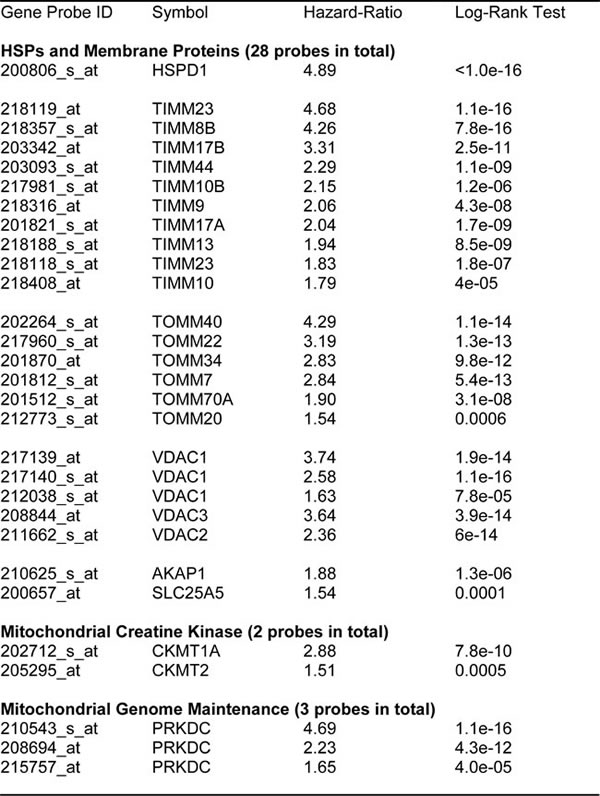 Initially, we examined the behavior of mitochondrial chaperones and mitochondrial membrane proteins. Table 3 and Figure 3 both show that HSP60 (HSPD1) has the best prognostic value, with a hazard-ratio of 4.89 (p < 1.0e-17). Members of the TIMM and TOMM gene families also had prognostic value; AKAP1 and SLC25A5 also had significant value. Similar results were also obtained with mitochondrial creatine kinase isoforms (HR = 2.88-to-1.51) and PRKDC (DNA-PK), a critical kinase that helps maintain the integrity and the copy number of the mitochondrial genome (mt-DNA) (HR = 4.69-to-1.65), which functions in the DNA damage response.