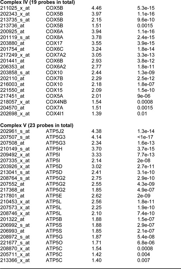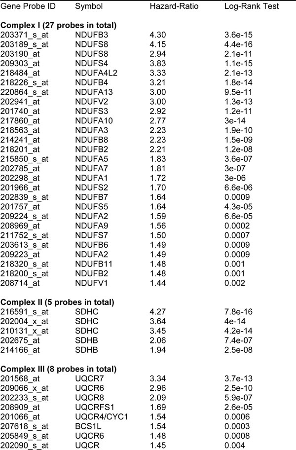We also assessed the prognostic value of members of the OXPHOS complexes I-V. These results are summarized in Table 5. Remarkably, 88 different gene probes for the OXPHOS complexes showed hazard-ratios between 4.46 and 1.39. COX5B (complex IV) had the best prognostic value (HR = 4.46; p = 5.3e-15). NDUFB3 (complex I) also showed significant prognostic value (HR = 4.30; p = 3.6e-15). Kaplan-Meier curves for members of complex I and II are shown in Figure 5A & 5B, while results with members of complex III and IV are shown in Figure 6A & 6B. Results with complex V are shown in Figure 7.