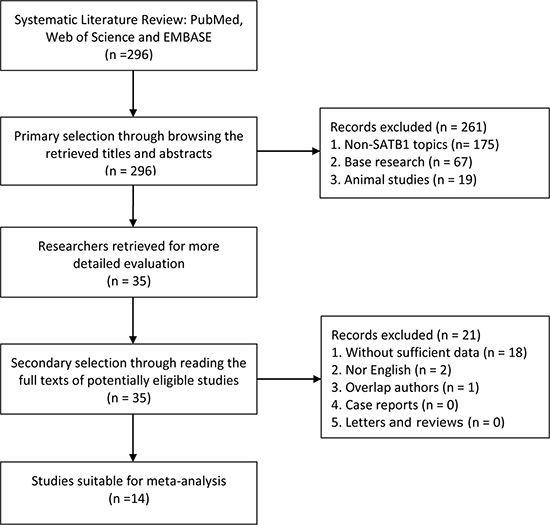 We conducted an exhaustive search of PubMed, Web of Science, and EMBASE for studies measuring the expression of DEK and survival in patients with solid tumors until January 2017. The search included the terms ‘‘DEK’’ and ‘‘neoplasms’’ or ‘‘cancer’’ or ‘‘tumor’’ or ‘‘survival’’ or ‘‘prognosis’’, and the results were restricted to human studies of solid tumors. All the potential studies were carefully searched for in the references.