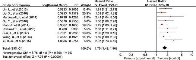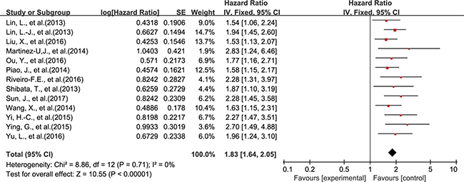 The association between DEK and prognosis was shown in Figure 2 and Figure 3. The results demonstrated that DEK overexpression was associated with poor survival outcome of solid tumor patients. The combined HR (HR = 1.83; 95% CI, 1.64–2.05, P < 0.00001) for OS (univariable analysis) with a fixed-effects model showed no significant heterogeneity among the 13 included studies (P = 0.71, I2 = 0%) (Figure 2). The combined HR (HR = 1.70; 95% CI, 1.48–1.96, P < 0.00001) for OS by multivariable analysis with a fixed-effects model also showed no significant heterogeneity among the 9 included studies (P = 0.36, I2 = 9%) (Figure 3).