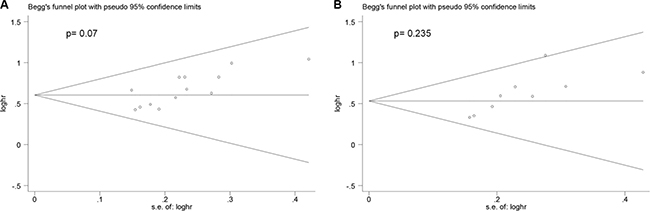 Begg’s funnel plot and Begg’s test were conducted to assess the publication bias of the included trials. As is shown in Figure 4, the shape of the funnel plots presented no significant asymmetry. The P values of Begger’s test for OS with univariable and multivariable analysis were 0.07 and 0.235, respectively, indicating the absence of an obvious publication bias in these analyses.