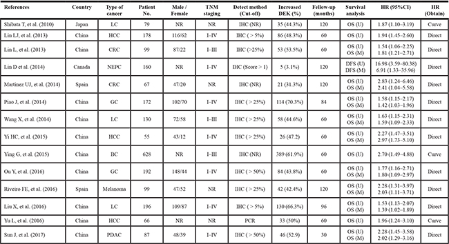 To our knowledge, this is the first systematic review elaborate about the association of DEK overexpression with OS of human solid tumors. We systematically evaluated the survival data of 2208 patients with solid tumors included in the 14 eligible studies. The results suggested that the overexpression of DEK is a biomarker of poor prognosis in human solid tumors, with similar results of OS for different types of tumors; the high level of DEK expression was related to poor OS among different types of solid tumors. Thus, further studies are imperative to clarify the underlying mechanism and role of DEK in pathogenesis and prognostic merit in human solid tumors.