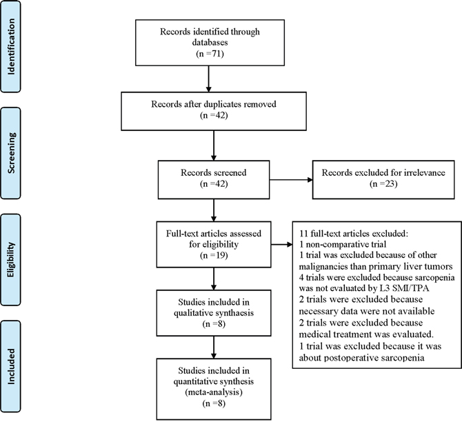 Database searches yielded 71 entries, of which 52 were excluded because of duplications (29 trials) or irrelevance (23 trials). Of the 19 publications that qualified for abstract review, 1 was excluded because it was not a comparative trial, 1 trial was excluded because it included other malignancies than primary liver tumors, 4 trials were excluded because sarcopenia was not evaluated by the L3 skeletal muscle index (L3 SMI) or L3 total psoas area (L3 TPA), 2 trials were excluded because necessary data were not available, 2 trials were excluded because medical treatment was evaluated, and 1 trial was excluded because it was about postoperative sarcopenia. The Preferred Reporting Items for Systematic Reviews and Meta-Analysis (PRISMA) flow diagram for study selection is shown in Figure 1.