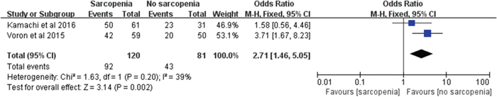 Two trials [12, 22] including 201 participants reported the recurrence of HCC/ICC after treatment. Our results showed that sarcopenia had a significantly negative impact on patients with HCC/ICC (RR: 2.71; 95% CI: 1.46-5.05; P=0.002; Figure 4). The results were homogeneous (χ2=1.63, P=0.20, I2=39%; Figure 4).