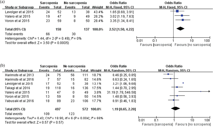 Regarding post-treatment complications, they remain controversial. Valero et al. [21] showed that the presence of sarcopenia was an independent predictive factor of OCs and MCs. However, evidence [19] has also shown sarcopenia did not increase the incidence of OCs. The available data from our meta-analysis suggested that sarcopenia increased the incidence of OCs significantly. However, our study provided no evidence of an increased risk of MCs in sarcopenic patients. The reasons below might account for the non-statistically significant difference in MCs: 1) patients with sarcopenia might receive more intensive care before, during and after treatment; and 2) the absence of a sub-analysis of each complication might have caused potential bias because each complication that develops after HCC/ICC treatment could have a different relationship or causality with sarcopenia and a different impact of prognosis.