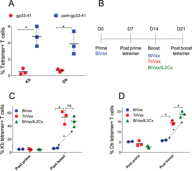 Figure 1: Optimization of gp33-41 vaccination strategy in WT mice. (A) WT mice were primed with equimolar amounts of the pam-gp33-41 (Pam2-KMFVTAPDNLGYM) or minimal gp33-41 peptide (KAVYNFATM) and 50 μg poly-IC and 7 days later the immune responses were evaluated by tetramer staining in blood. (B) Diagrammatical representation of the vaccination protocol for panels C and D. (C, D) WT mice were primed with pam-gp33-41 BiVax and 14 days later they were boosted with pam-BiVax, pam-BiVax/IL2Cx or pam-TriVax. The percentages of Kb (B) and Db (C) tetramer+ CD8 T cells in blood after prime and boost are shown. Results are presented for individual mice (each symbol) with the mean ± SD for each group. (*p<0.05, ns: not significant).