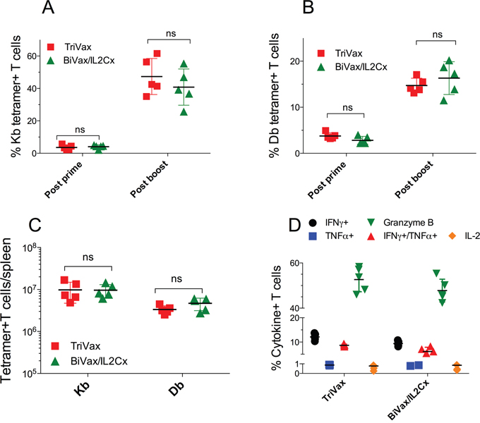 Figure 2: TriVax or BiVax/IL2Cx generate vast T cell responses in RIP-gp mice. (A, B) RIP-gp mice were vaccinated with pam-gp33-41 BiVax and 14 days later they were boosted with TriVax or BiVax/IL2Cx. Percentage of Kb (A) and Db (B) tetramer+ CD8 T cells in the blood. (C) Total numbers of Kb and Db specific CD8 T cells in spleens after boost. (D) Splenocytes were stimulated in vitro with the minimal gp33-41 peptide in the presence of Golgiplug for 6 h and the production of IFNγ, TNFα, IFNγ/TNFα, IL-2 and granzyme B was assessed by intracellular staining. Results are presented for individual mice (each symbol) with the mean ± SD for each group. (ns: not significant).