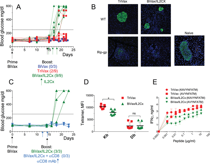Figure 3: BiVax/IL2Cx but not BiVax alone or TriVax induces diabetes in Rip-gp mice. (A-E) RIP-gp mice were vaccinated as described in Figure 1B. (A) Blood glucose levels in individual mice (each symbol) from at least 3 independent experiments. (B) Insulin staining in formalin fixed pancreatic tissues of WT and RIP-gp mice after TriVax or BiVax/IL2Cx boost was analyzed 8 days after the booster vaccination. (C) RIP-gp mice were primed with BiVax followed by BiVax/IL2Cx. Some mice received 500 μg of αCD8 mAb (i.p.) at days 12 and 14. Blood glucose levels were measured to assess diabetes. (D) Mean fluorescence intensity (MFI) of tetramer stains for Kb and Db specific cells in RIP-gp mice. Each symbol represents an individual mouse. (E) Purified CD8 T cells were incubated with serial dilutions of the minimal Db (KAVYNFATM) or Kb (AVYNFATM) peptides and 48 h later the production of IFNγ in the supernatants was assessed by ELISA. Dashed horizontal lines in A and C represents maximal normal blood glucose level. (*p<0.05, ns: not significant).