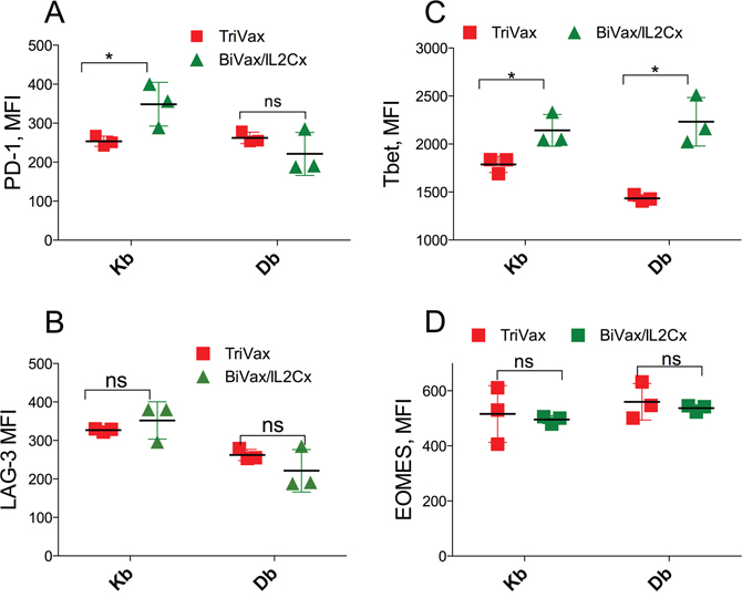 Figure 4: BiVax/IL2Cx generates T cell with relatively high Tbet expression. (A-D) RIP-gp mice were vaccinated as in Figure 1B and spleens were collected 7 days after the boost. MFI of PD-1 (A) and LAG3 (B) expression on the surface of Kb and Db specific T cells are shown. MFI of Tbet (C) and Eomes (D) expression in Kb and Db specific T cells. Results are presented for individual mice (each symbol) with the mean ± SD for each group. (*p<0.05, ns: not significant).