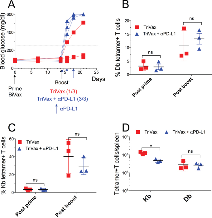Figure 6: TriVax/αPD-L1 combination induces diabetes in RIP-gp mice. RIP-gp mice were primed with pam-gp33-41 BiVax and 14 days later they were boosted with TriVax with or without αPD-L1 mAb (200 μg/mouse i.p. at days 14, 16 and 18). (A) Blood glucose levels in individual mice (each symbol) for each group. Percentages of Db (B) and Kb (C) tetramer+ CD8 T cells in the blood. (D) Absolute numbers of Kb and Db tetramer+ CD8 T cells in spleens. Results are presented for individual mice (each symbol) with the mean ± SD for each group. (ns: not significant).