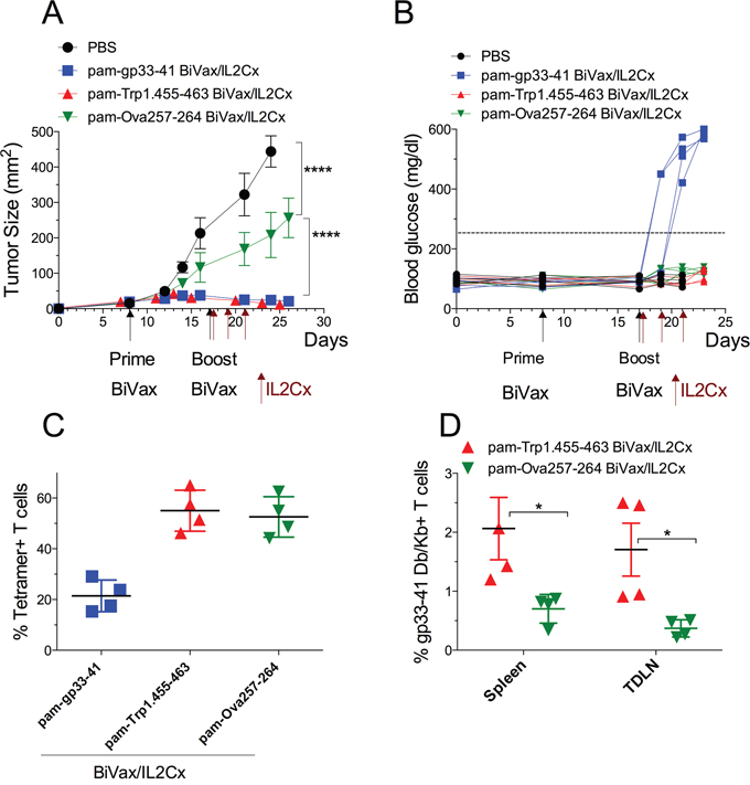Figure 8: BiVax/IL2Cx utilizing tumor specific antigen controls tumor growth with limited autoimmune pathology. RIP-gp mice were inoculated s.c. with B16F10gp33-41 melanoma cells (3 x 105 cells/mouse) and 8 days later they received either pam-gp33-41 BiVax, pam-Trp1.455-463 BiVax or pam-Ova257-263 BiVax. Nine days later (17 days after tumor inoculation) mice were boosted with the same peptide plus IL2Cx (administered on days 17, 19 and 21). (A) Mean tumor sizes and (B) blood glucose levels in individual mice (each symbol) for each group. (C) Percentages of tetramer+ CD8 T cells in the blood at day 25 after tumor inoculation (Kb tetramer responses for gp33-41). (D) Percentage of gp33-41 Db/Kb+ T cells in spleen and tumor draining lymph nodes (TDLN) of Trp1 and Ova vaccinated mice. Results are presented for individual mice (each symbol) with the mean ± SD for each group. (*p<0.05, ****p<0.0001, ns: not significant).