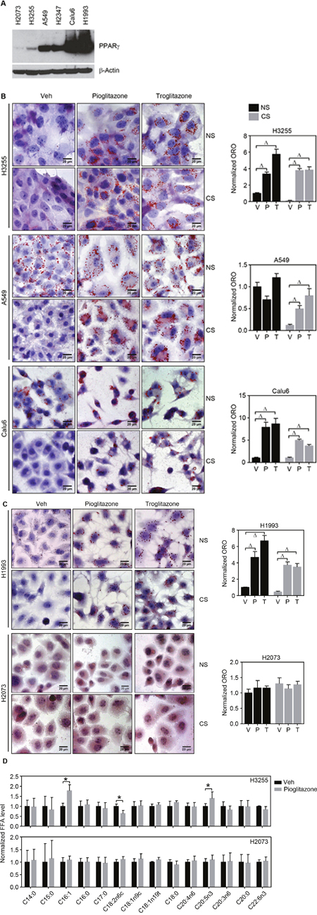 Figure 1: TZD treatment induces de novo lipid synthesis in lung cancer cells. (A) Endogenous expression of PPARγ in a panel of lung cancer cells. (B, C) ORO lipid staining upon PPARγ activation in the lung panel. Five lung cancer cell lines involving H3255, A549, and Calu6 (B); H1993 and H2073 (C) were treated with 30 μM of pioglitazone or 10 μM of troglitazone for 5 days in the RPMI media supplemented with 5% complete serum (or normal serum (NS)) or 5% lipid-depleted serum (or charcoal stripped serum (CS)), followed by ORO staining to detect lipid droplet accumulation. Note that H1993 and H2073 are the paired-match metastatic and primary tumors cells established from the same patient and PPARγ positive and PPARγ negative, respectively. All images of lipid staining were quantitatively represented as shown in bar graphs (right column). (D) Metabolic profiling of fatty acids upon ligand activation of PPARγ. Lung cancer cells H3255 (PPARγ positive) and H2073 (PPARγ negative) were treated with 30 μM of pioglitazone for 5 days in the RPMI media supplemented with 5% CS, followed by free fatty acid extraction and HPLC analysis to profile lipid content. Values are mean ± S.E.M. Difference between vehicle and treated samples was analyzed using one-way ANOVA (Tukey’s post-tests) (B and C) or 2-tailed unpaired t-test (D). * p < 0.05; # p < 0.01; Δ p < 0.001.