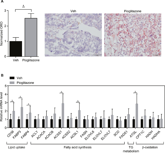 Figure 4: PPARγ regulation of lipid metabolism in the xenograft model. In vivo xenograft tumor model was established by injecting PPARγ-positive A549 lung cancer cells into the flank of athymic nude mice. The xenografted mice were intraperitoneally injected with vehicle (n = 4) or pioglitazone 20mg/kg (n = 5) every other day for 3 weeks. At the end of the experiment, tumor tissues were isolated for ORO staining (A) and QPCR assay (B) for metabolic genes involved in lipid metabolism. ORO staining was performed in different tumor sections for each group (vehicle, n = 4; pioglitazone, n = 5). On each tumor section, pictures were taken from 10 separated regions. Representative pictures were shown. Values are mean ± S.E.M. 2-tailed unpaired t-test was applied for statistical analysis. * p < 0.05; # p < 0.01; Δ p < 0.001.