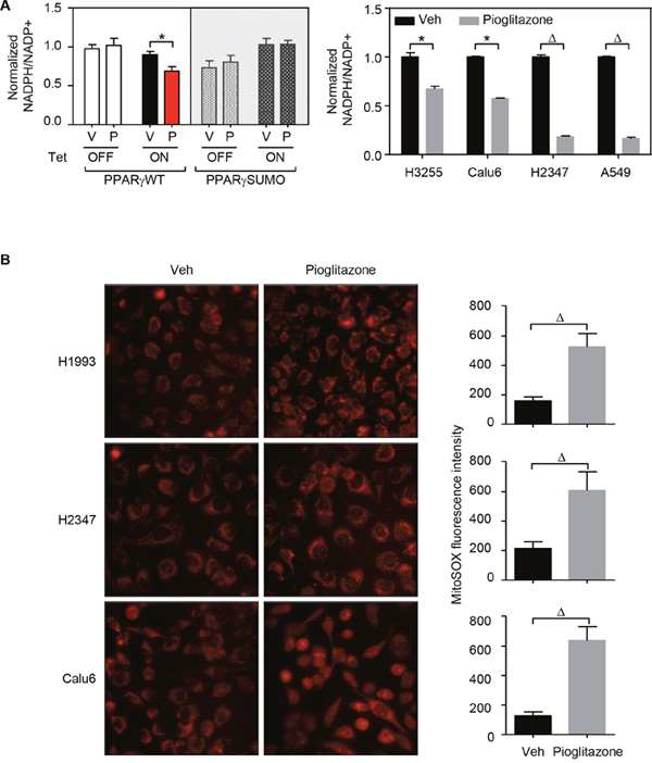 Figure 5: PPARγ activation disrupts REDOX balance in lung cancer. (A) NADPH level upon pioglitazone treatment. HBEC cells and lung cancer cell lines (H3255, Calu6, H2347, and A549) were treated with 3μM or 30 μM of pioglitazone for 48 hours, respectively. The samples were then followed by measurement assay of NADPH level. (B) ROS level upon pioglitazone treatment. Three lung cancer cells (H1993, H2347, and Calu6) were treated with 30 μM of pioglitazone for 48 hours, followed by measurement assay of mitochondrial ROS level, mitoSOX. Mitochondrial ROS measurement was performed in three different coverslips for each group. On each coverslip, pictures were taken from 10 separated regions. Representative pictures were shown. Statistical analysis of One-way ANOVA (Tukey’s post-tests) or 2-tailed unpaired t-test was applied for HBEC sample or for lung cancer cells, respectively. * p < 0.05; # p < 0.01; Δ p < 0.001. Values are mean ± S.E.M.