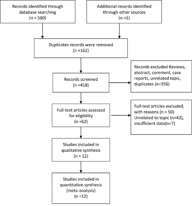 The Figure 1 presented the process of trials selection. We identified 580 records through database searching, and identified one record through retrieving the references lists of articles and review. 418 articles were left for titles and abstracts screened after 162 duplicates records were removed. We excluded comments, case reports, unrelated topics, and 62 articles were planned for full-text scanning. Fifty studies were excluded for insufficient data and unrelated topics. Finally, twelve studies were included in qualitative and quantitative synthesis [7–9, 11–19].