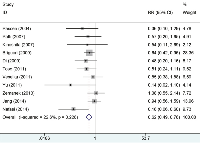 The general characteristics of results were summarized in Table 1. These studies were published from 2004 to 2014. Sample size ranged from 42 to 668, with the number of 2801 patients. The duration of follow-up ranged from 1 to 45 months. Of these included studies, six studies reported patients with stable angina pectoris solely, four were conducted in patients with non-ST segment elevation acute coronary syndrome. One included unstable and stable angina pectoris, and one included stable angina pectoris and not-ST segment elevation acute coronary. The intervention in trials was taking Atorvastatin preoperative, and control group received placebo (routine treatment). Four studies reported history of Atorvastatin in study population and eight studies reported no history of Atorvastatin. The does and time settings were different among trials. All studies were performed among adult.