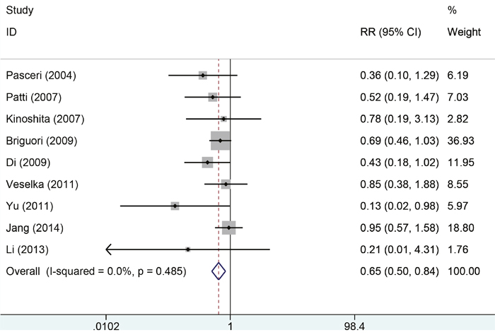 Eleven studies with 2850 patients reported the incidences of myocardial infarction. Compared with control group, high-does Atorvastatin significantly reduced the risk of myocardial infarction in patients with percutaneous coronary intervention (Relative risk (RR) =0.62, 95% confidence interval (CI): 0.49-0.78, Figure 3), with low level of heterogeneity (I2=22.6%, P=0.228). Trial sequential analysis of 12 trials (black square filled icons) illustrating that the cumulative z curve crossed both the conventional boundary for benefit and the trial sequential monitoring boundary for benefit, establishing sufficient and conclusive evidence and suggesting that further trials are not required. A diversity-adjusted required information size of 3,235 patients was calculated using a 0.05 (two-sided) and b =0.20 (power of 80%), an anticipated relative risk reduction of 20%, and an event proportion of 45% in the control arm. Nine studies with 2248 patients reported the adverse cardiovascular events. No significant heterogeneity was found for this estimation (I2=0.0%, P=0.458), and a fixed-effect model was applied. Compared with control group, patients with high-does Atorvastatin taken, the risk of adverse cardiovascular events was degraded by 65% (RR=0.65, 95%CI: 0.50-0.84, Figure 4).