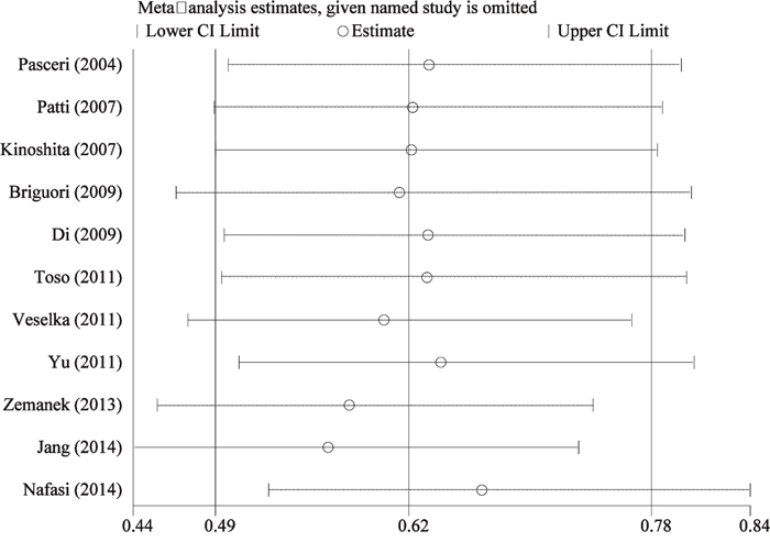 To explore the stability of pooled results, we conducted sensitivity analyses through excluding single study each time. The Figure 6 presented results of sensitivity analyses, the estimations with one study excluded still fallen into the 95%CI range of overall pooled result. This point indicated the combined results was reliable and stable. We assessed the publication bias by inspecting funnel plot and qualitative statistical test. The Egger and Begg test found no publication bias (t=-1.670, P=0.129; Z=1.560, P=0.119). The funnel plot given slight asymmetry (Supplementary Material 1).