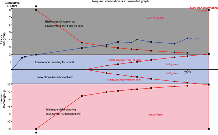 Figure 7: Trial sequential analysis of included trials comparing trial group and with control group for incidence of myocardial infraction (X axis = number of patients randomized; Y axis=cumulative z score; horizontal green dashed lines=conventional boundaries (upper for benefit, z score=1.96; lower for harm, z score=–1.96; two-sided P=0.05); sloping red lines with black filled circles=trial sequential monitoring boundaries calculated accordingly; blue line with black filled squares=z curve; vertical red line=required information size calculated accordingly; upper gray rectangle: area of benefit; middle blue rectangle=futility area; lower red rectangle=area of harm).