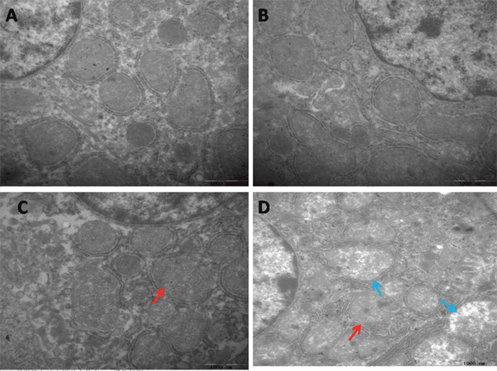 Figure 1: Effects of PAMK and HS on the ultrastructural changes in the chicken spleen. (A) Spleen in the control group. (B) Spleen in the PAMK group. (C) Spleen in the PAMK+HS group. (D) Spleen in the HS group. The HS group showed mitochondrial vacuole (blue arrows) and mitochondrial swelling (red arrows). The pathological injuries in PAMK+HS group showed mitochondrial swelling (red arrows), but the degree of injury was less serious than that in HS group.