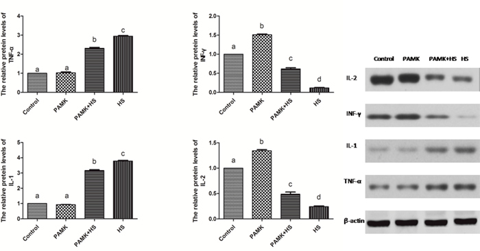 The protein levels of cytokines in the chicken spleen were showed in Figure 3. There were no significant changes between the control and the PAMK groups (p > 0.05). The relative protein levels of Interleukin 1β (IL-1β) and necrosis factor-α (TNF-α) were markedly higher and that of Interleukin 2 (IL-2) and interferon gamma (INF-γ) were lower in the HS group than those in the control group (p < 0.05). PAMK significantly decreased the protein levels of IL-1β and TNF-α (p < 0.05) and also remarkably increased that of IL-2 and IFN-γ compared with the HS group (p < 0.05), but did not bring them to the group levels (p > 0.05).
