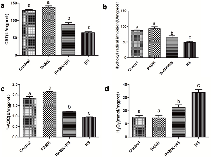 Changes of CAT activities, T-AOC, hydrogen peroxide (H2O2) content and hydroxyl radical (·OH) inhibition in the chicken spleen were showed in Figure 4. There were no significant differences between the control group and PAMK groups (p > 0.05). CAT activities, T-AOC and ·OH inhibition were significantly lower and the H2O2 content was higher in the HS group than that in the control group. However, the co-treatment of PAMK and HS observably alleviated those changes compared with the HS group (p < 0.05), but did not bring them back to the control level (p > 0.05).