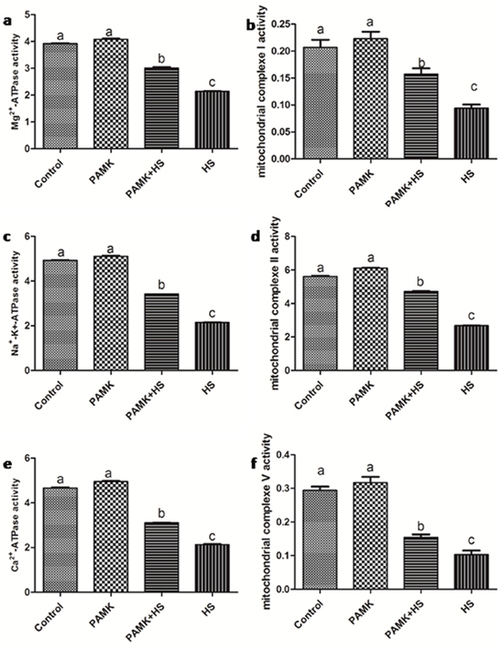 The activities of the mitochondrial complexes and ATPases in the chicken spleen were showed in Figure 5. There were no significant changes between the control group and the PAMK group (p > 0.05). In the HS group, the activities of mitochondrial complex I, II and V, Mg2+-ATPase, Na+-k+-ATPase and Ca2+-ATPase were significantly decreased compared with the control group (p < 0.05). In the PMAK+HS group, the activities of mitochondrial complexes and ATPases were observably enhanced compared with the HS group (p < 0.05), but did not reach to the control group level (p < 0.05).