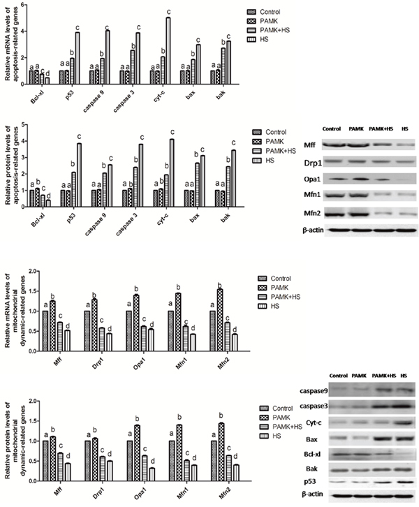 The expressions of mitochondrial dynamics- and apoptosis-related genes in the chicken spleen were shown in Figure 6. The results showed that both mitochondrial fission- and fusion-related genes were up-regulated in the PAMK group and down-regulated in HS group compared to the control group (p < 0.05). Compared with the control group, the mRNA and protein levels of Cyt-c, p53, Bak and Bax were significantly increased, but that of Drp1, Mfn1, Mfn2, Mff, Opa1, and Bcl-xl were markedly decreased in the chicken spleen of the HS group (p < 0.05). However, in the PAMK+HS group, PAMK co-treatment significantly attenuated these changes induced by HS (p < 0.05).