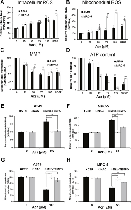 Figure 2: Acrolein induces mitochondrial ROS over-production, mitochondrial membrane potential and ATP content reduction, and NAC or Mito-TEMPO pretreatment eliminates these effects. In panels (A & B), cells were treated with different concentrations of Acr (0-100 μM) or H2O2 (250 μM) for 1 h, and (A) the intracellular and (B) mitochondrial ROS production were detected by DCF and MitoSOX Red staining assays, respectively. In panels (C & D), cells were treated with different concentrations of Acr (0-100 μM) or CCCP (100 μM) for 3 h and (C) the mitochondrial membrane potential (MMP) and (D) the ATP content were measured by JC-1 assay for MMP and ATP bioluminescence assay kits, respectively. In panels (E-H), cells were pretreated with NAC (5 mM) or Mito-TEMPO (100 μM) for 1 h and then subjected to Acr treatment (A549: 100 μM; MRC-5: 50 μM) for 1 h; the (E & F) mitochondrial ROS production and the (G & H) MMP were measured as described above. Bar graphs show data collected from 3 independent experiments. Data are mean ± s.d. * P< 0.05; ** P<0.01; ***P<0.005.