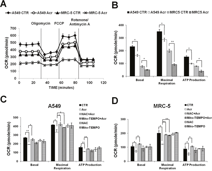 Acr is abundant in tobacco smoke [1, 4] and Acr is a mitochondrial toxin [26]. It is likely that mitochondrial dysfunction caused by Acr may play an important role in its toxicity in smoking-related diseases [27–29]. To test this possibility, we determined the effect of Acr on mitochondria function and integrity. Results in Figure 2 show that Acr increases production of intracellular and mitochondrial ROS (mtROS) (Figure 2A & 2B) and causes dose-dependent decreases of mitochondrial membrane potential (MMP) (Figure 2C) and ATP content (Figure 2D). Pretreatment of cells with an antioxidant, N-acetylcysteine (NAC) or a mitochondria specific antioxidant, Mito-TEMPO rescued Acr-induced ROS production from mitochondria (Figure 2E & 2F), MMP reduction (Figure 2G & 2H) and cytotoxicity (Supplementary Figure 3). To further analyze the effects of Acr on mitochondrial respiration, we measured the oxygen consumption rate (OCR) in A549 and MRC-5 cells using Seahorse Bioscience’s XF96 Analyzer. Results in Figure 3 show that significant reductions in basal respiration, ATP turnover, and maximal respiratory capacity were observed in A549 and MRC-5 cells after a short (1 h) exposure with Acr (Figure 3A & 3B), and show that NAC or Mito-TEMPO pretreatment reverted Acr-induced decreases in basal respiration, ATP turnover, and maximal respiratory capacity of the mitochondria to normal levels (Figure 3C & 3D). Collectively, these results suggest that Acr suppresses mitochondrial respiration via overproduction of mtROS.