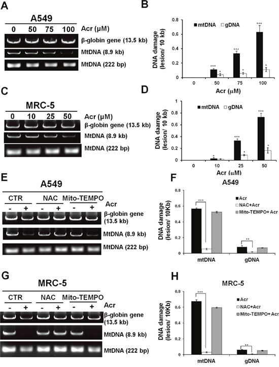 Figure 4: Acrolein induces more DNA damages/ unit length DNA in mtDNA than in nDNA. In panels (A & C), cells were treated with Acr (A549: 0-100 μM, MRC-5: 0-50 μM for 6 h), DNA was extracted, following by QPCR with specific primers against mtDNA (8.9kb, 222bp) and nDNA (β-globin, 13.5kb). The resultant DNAs were separated by electrophoresis in a 1% agarose gel as previously described [67]. Panels (B & D) show quantifications of DNA damages in mtDNA and nDNA. In panels (E & G), cells were pretreated with NAC (5 mM) or Mito-TEMPO (100 μM) for 1 h followed by Acr treatment (A549: 100 μM, MRC-5: 50 μM) for 6 h. DNA damages in mtDNA and nDNA damages were analyzed, the same as described above. Panels (F & H) show quantifications of Acr-induced DNA damages in mtDNA and nDNA in cells pretreated with NAC (5 mM) or Mito-TEMPO (100 μM). Bar graphs show data collected from 3 independent experiments. Data are mean ± s.d. * P< 0.05; ** P<0.01; ***P<0.005.
