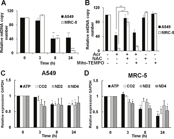 Since the maintenance of mtDNA quality is crucial for mitochondrial homeostasis, accumulation of damaged mtDNA may induce mutated mtDNA, including mtDNA copy number alterations [12]. Results in Figure 5 show that Acr reduced mtDNA copy number in both A549 and MRC-5 cells (Figure 5A) and that pre-treatment of NAC, but not Mito-TEMPO, reversed the reduction of mtDNA copy number (Figure 5B). In addition, we found that Acr also reduced expression of mitochondrial genes (Figure 5C & 5D) parallel to the reduction of mtDNA copy number. These results indicate that Acr-induced mtDNA damages result in alteration of mtDNA copy number, and reduction of mitochondrial gene expressions.