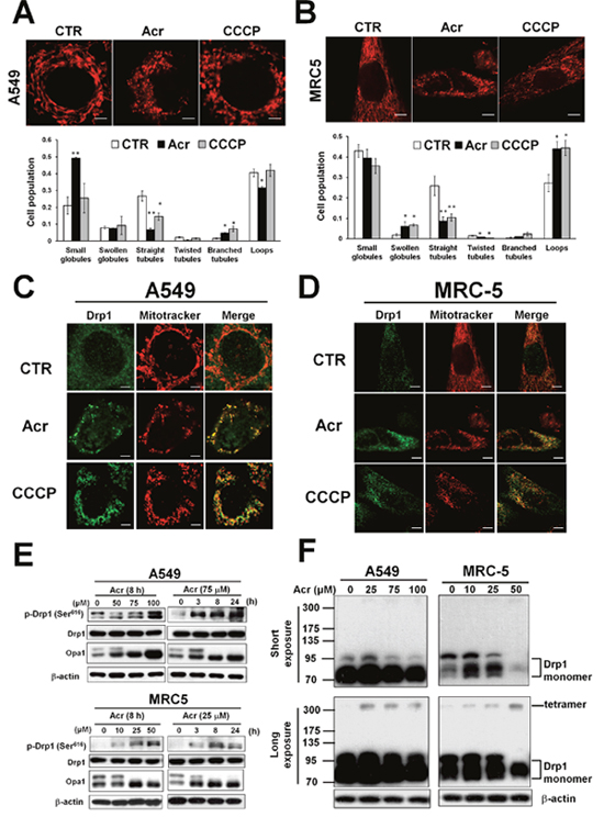 Figure 6: Acrolein induces mitochondrial fission. In panel (A & B), A549 and MRC-5 cells were treated with Acr (A549: 75 μM, MRC-5: 25 μM) for 8 h, and stained with mitotracker (upper) and the mitochondrial morphology change was quantified (lower). Bar graphs show data collected from 3 independent experiments. Data are mean ± s.d. * P< 0.05; ** P<0.01. In panels (C & D), Drp1 translocation was detected by immunofluorescent staining assay. A549 and MRC-5 cells were treated with Acr (A549: 75 μM, MRC-5: 25 μM) or CCCP (20 μM) for 8 h at 37°C, fixed, stained with Drp1, and then examined by microscopy. Mitotracker was used to stain mitochondria. Phosphorylated Drp1 (p-Drp1, Ser616), Drp1, OPA1 (panel E) and tetramerization of Drp1 (panel F) in Acr-treated cells was detected by Western blot analysis. Note: Acr induces phosphorylation of Drp1 at Ser616 site followed by tetrameriaztion of Drp1 and cleavage of OPA1 indicating that Acr induces mitochondrial fission.
