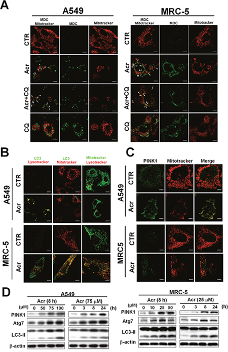Using MDC staining, the bright green dots, which indicate autophagosomes, increased in the cytoplasm of Acr-treated A549 and MRC-5 cells and co-localized with mitochondria stained with Mitotracker Red as indicated by arrows (Figure 7A). Further, LC3 punta were formed in Acr-treated cells and superimposed with mitochondria by immunofluorescent staining assay (Figure 7B). Consistently, we found that Acr treatment in A549 and MRC-5 cells increased Atg7 and the formation of LC3-II, a hallmark of the autophagy pathway (Figure 7D). In addition, PINK stabilization and translocation to mitochondria were detected by Western blot and immunofluorescent staining analyses, respectively (Figure 7C & 7D). Colocalization of lysosomes stained by lysotracker with mitochondria stained by Mitotracker Red or with LC3 punta by immunofluorescent staining assays (Figure 7B) was also observed in cells treated with Acr. Together, these data indicate that Acr induces the mitophagy pathway which is followed by mitochondrial fission.