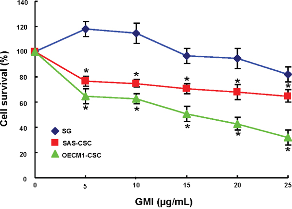 We first investigated the cell survival of these two OCSCs derived from oral cancer cell lines and normal human gingival epithelioid cell line (SG) in order to understand the cytotoxicity of GMI. We treated these cells with increasing concentrations of GMI for 24 hours followed by MTT assay. As shown in Figure 1, GMI markedly suppressed the cell viability of two OCSCs without causing toxic damage to normal cells.