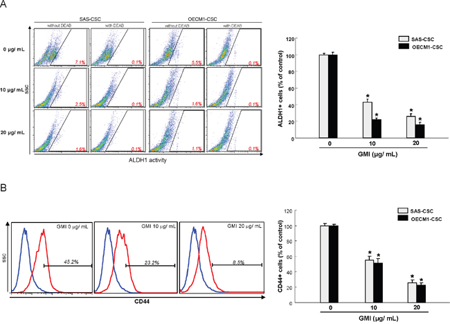 GMI attenuates ALDH1 activity and CD44 positivity in OCSCs