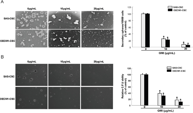 Figure 3: Inhibition of self-renewal property and clonogenicity in OCSC under GMI treatment. (A) Secondary sphere formation ability of GMI-treated cells was examined. The bar graph shows quantification of secondary sphere number. (B) OCSC with dose-dependent GMI treatment were assigned for the colony formation assay. The experiments were repeated three times and representative results were shown. Results are means ± SD. *, p<0.05.